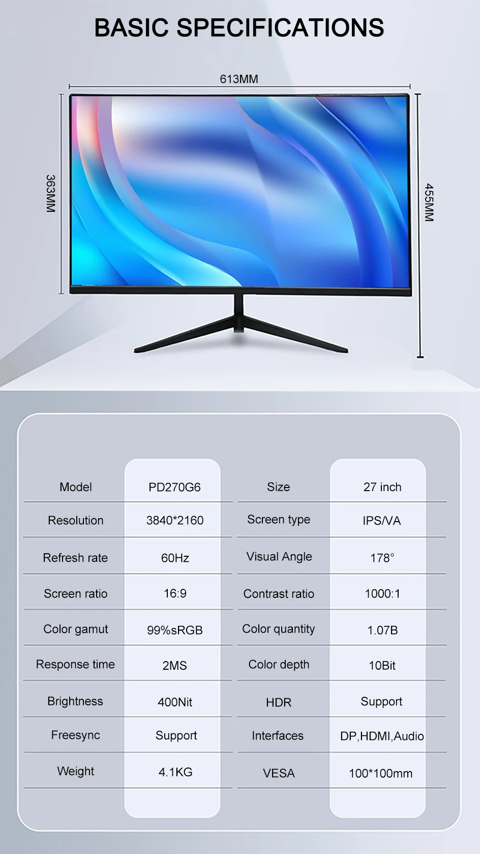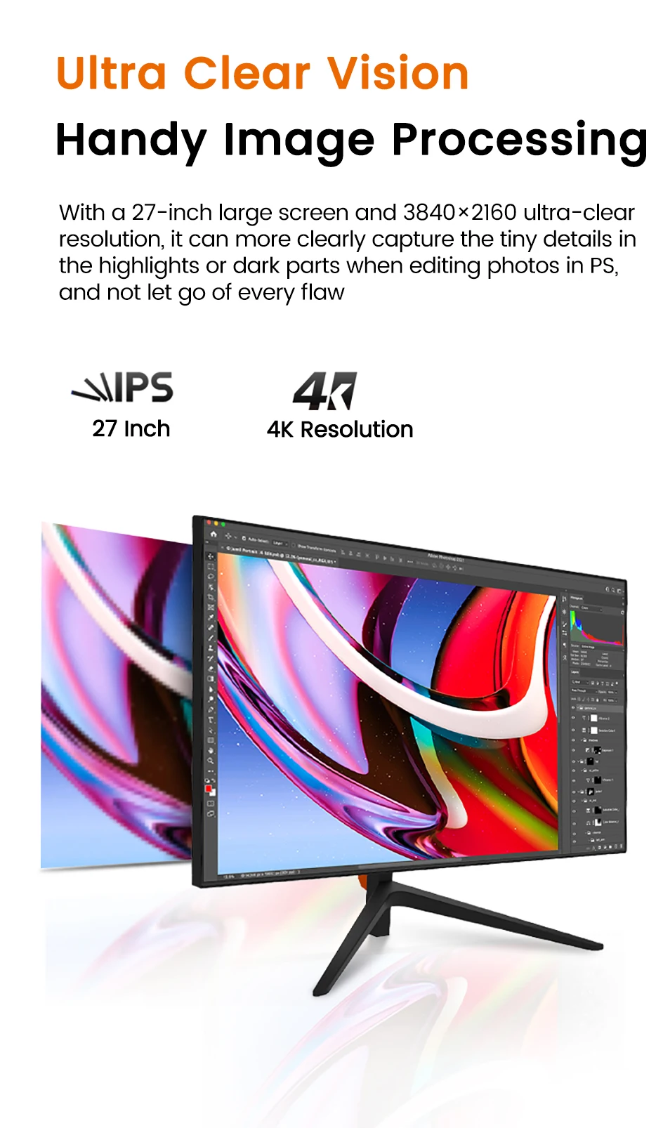 Le moniteur UHD 4K de 27 pouces est parfait pour le design et la rédaction. Avec une résolution de 3840*2160P, une couverture sRGB de 99% et une profondeur de couleur de 10 bits, cet écran IPS à bords ultra-fins offre une qualité d'image exceptionnelle. Compatible avec HDMI et DP, il est idéal pour les professionnels cherchant à améliorer leur flux de travail visuel.