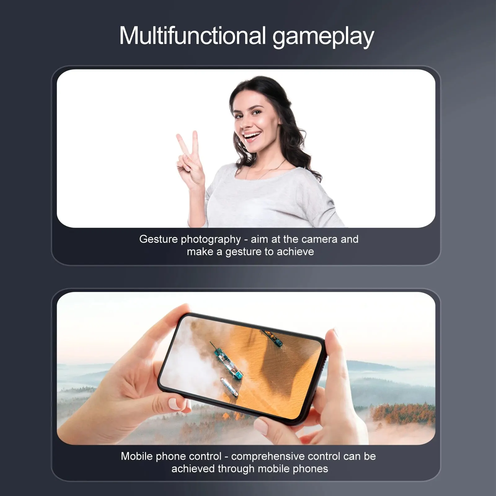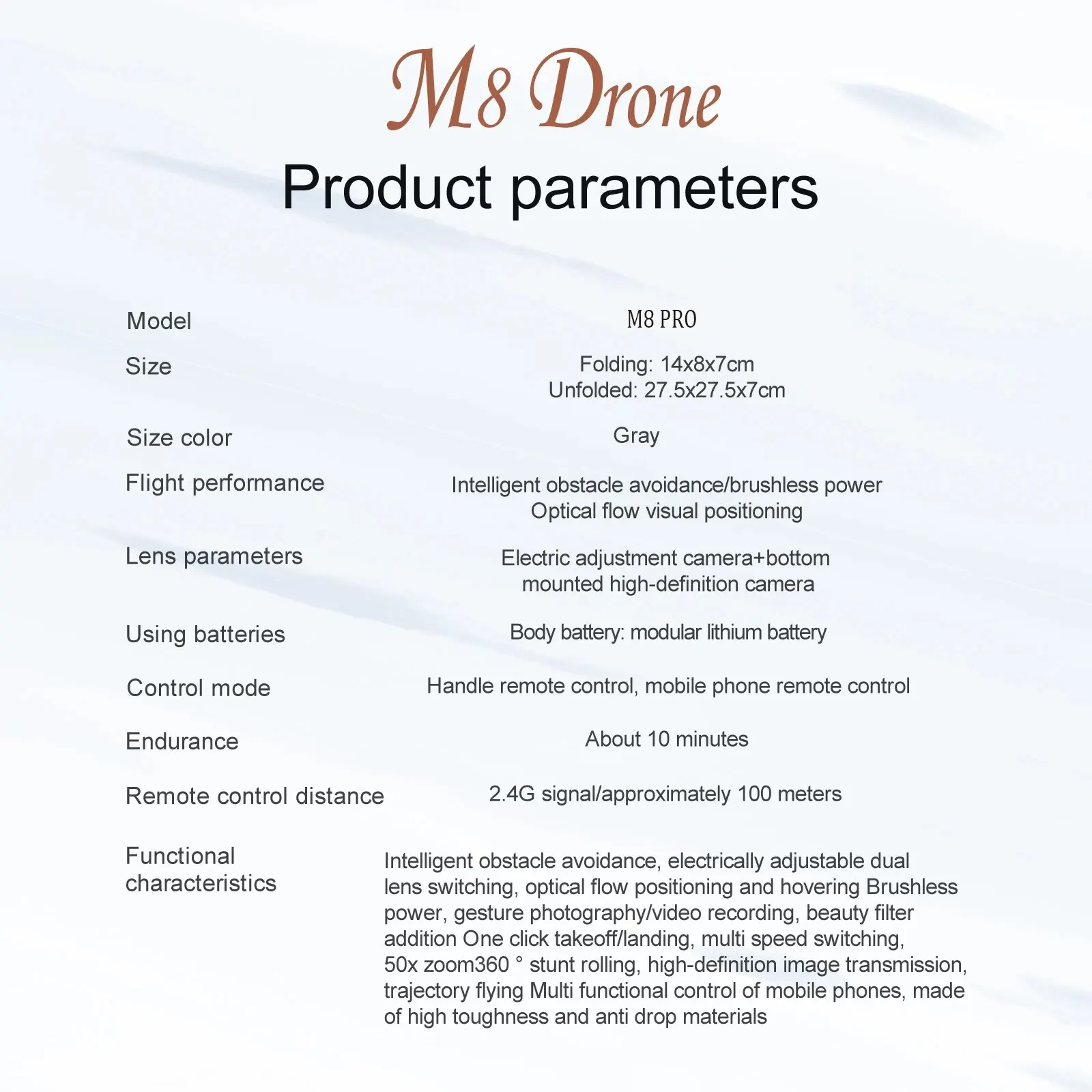 M8 drone function : 360 ° 4-sided infrared obstacle avoidance and height determination function, ultra long flight time, six pass band gyroscope; One click takeoff, one click landing, 360 degree roll in front, back, left, right, up and down, forward and backward, left and right side flight, steering, headless mode (with camera added functions: gesture photography, video recording, music, big head stickers, voice operation, emergency stop, trajectory flight, gravity sensing)
