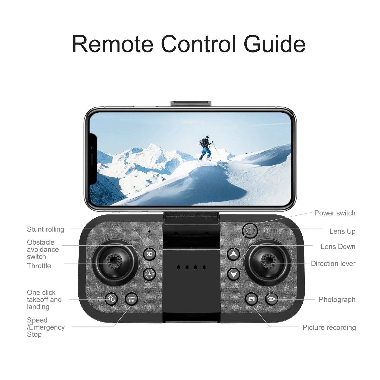 Familiarize yourself with control methods: Before use, carefully read theproduct manual and familiarize yourself with the control and operationmethods of drones.